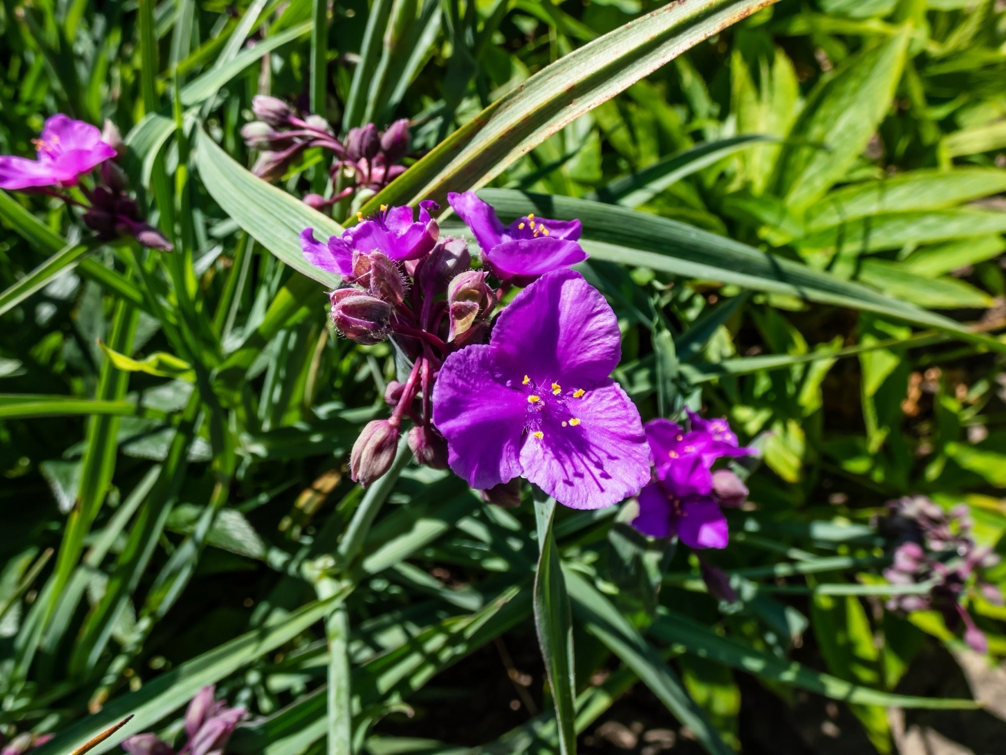 Tradescantia ‘Concord Grape’ forms a neat, clump-forming perennial that brings vibrant late summer colour to the garden. The foliage is narrow, lance-shaped and blue-green, giving a grassy, architectural backdrop even when not in flower. From early to late summer it produces clusters of three-petalled flowers in a rich violet-purple shade with bright yellow stamens. Each individual bloom lasts for a day, but the abundance of buds ensures a long flowering period, making it a reliable source of summer interest.
