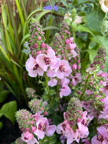 Verbascum 'Pink Domino' is a striking perennial that forms a neat rosette of grey-green, felted leaves. From early to mid-summer, it produces tall, upright spikes densely packed with soft pink flowers, each with a vivid magenta centre and golden stamens. The flowers rise high above the foliage, providing a beautiful contrast in borders, gravel gardens, or cottage-style plantings. Its tall, graceful stems and pastel tones make it an excellent feature plant for mixed perennial displays.