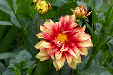 Dahlia ‘Dazzling Sun’ features vibrant, sunny yellow blooms with a fully double, rounded form. Upright and vigorous, it flowers from midsummer to autumn, adding bright, long-lasting colour and cheer to borders, beds, and cut flower arrangements.