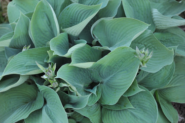 Hosta 'Blue Angel' is a hardy perennial prized for its enormous, blue-green foliage that forms a broad, mounded clump, creating a striking focal point in shaded garden areas. In midsummer, tall spikes of pale lavender flowers rise above the foliage, adding height, seasonal interest, and attracting pollinators. Its bold leaf colour and impressive size make it ideal as a specimen plant or for adding structure to borders and woodland gardens.