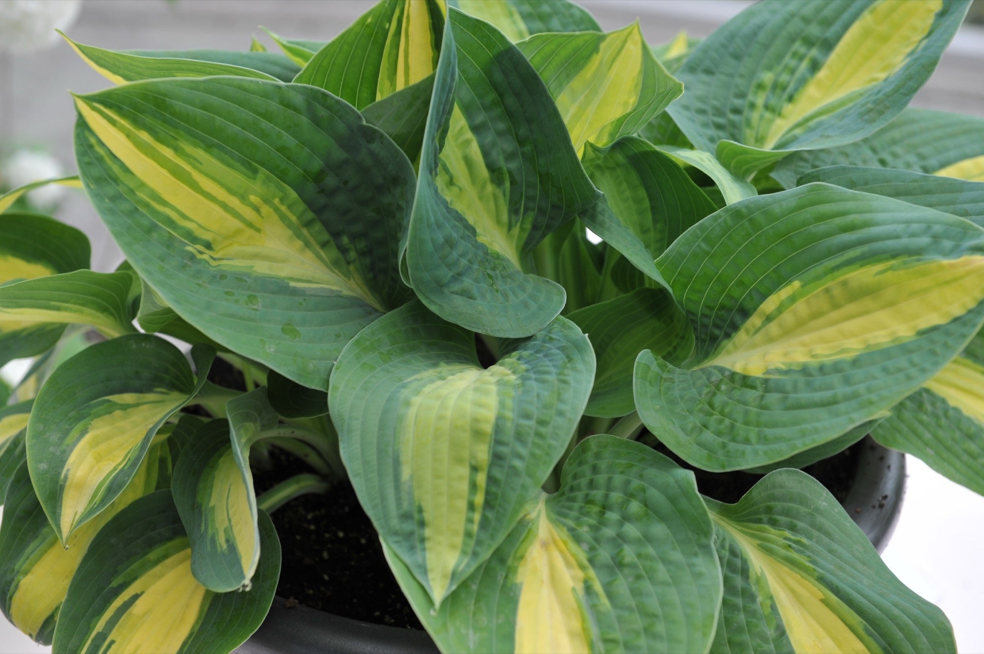 Hosta 'Chain Lightning' is a hardy perennial admired for its striking variegated foliage. The green leaves feature wide, creamy-white margins, forming dense, mounded clumps that add contrast and structure to shaded garden areas. In midsummer, upright spikes of pale lavender flowers rise above the foliage, providing height, seasonal interest, and attracting pollinators. Its bold leaf colour and tidy habit make it ideal for borders, woodland gardens, or container planting.