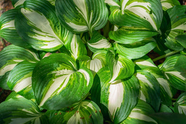 Hosta 'Enterprise' is a striking perennial that forms a dense, upright clump of thick, heart-shaped leaves. The foliage features a bright white centre surrounded by wide, dark green margins, creating a bold contrast that adds visual interest to shaded garden areas. The leaves are slightly wavy and have a slightly corrugated texture, enhancing their ornamental appeal.