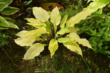 Hosta ‘Lipstick Blonde’ is a striking perennial prized for its bold foliage and vivid stem colour. The leaves are lance-shaped, bright yellow with a slightly crumpled or corrugated texture, and they sit atop intense red petioles, creating a dramatic and eye-catching display, especially when planted in partial shade with morning sun. As the season progresses, the yellow foliage retains its vibrancy when given enough light, though too much shade can cause the colour to fade.