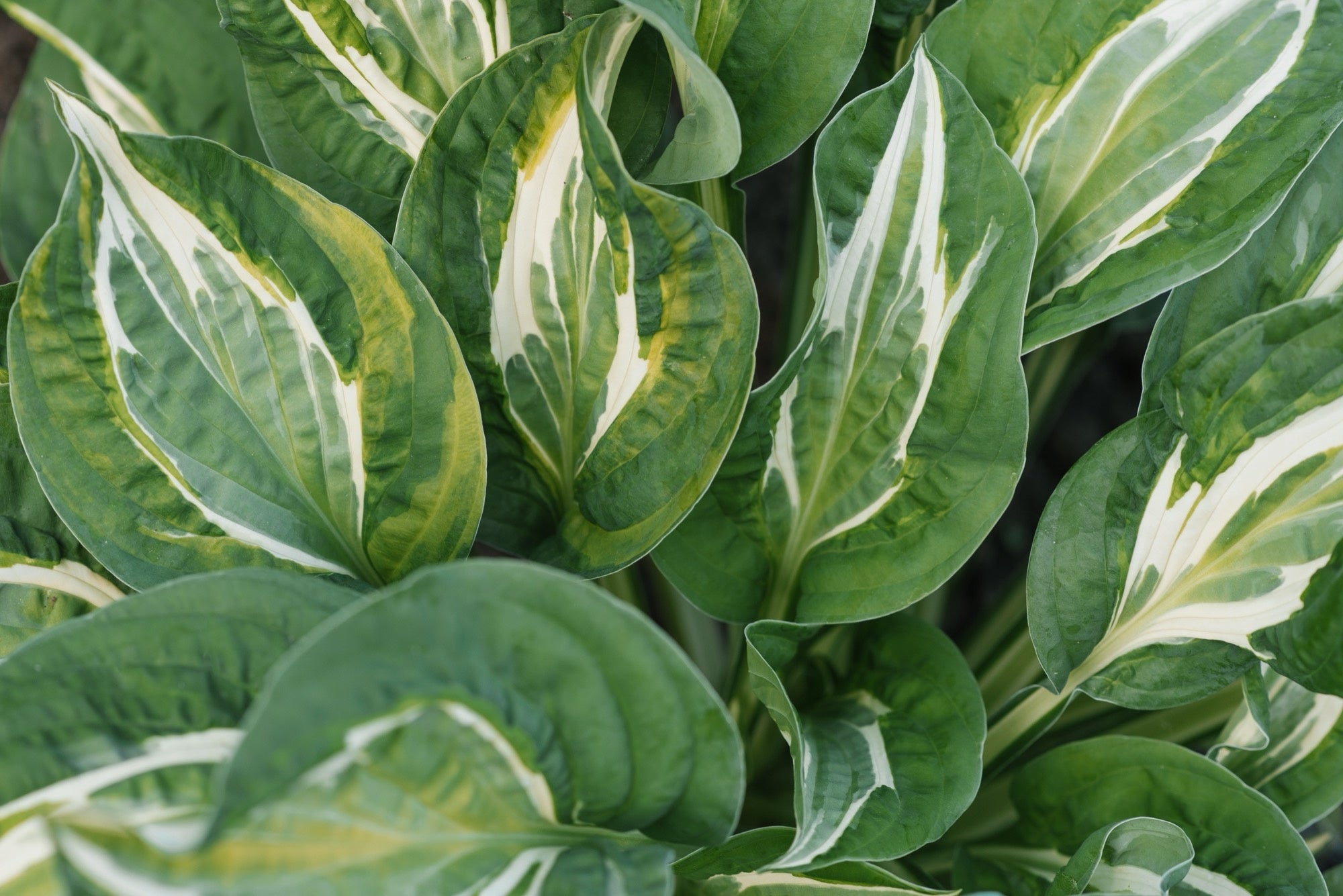 Hosta 'Striptease' is a striking perennial renowned for its bold, variegated foliage and refined habit. The large, heart-shaped leaves are thick, slightly corrugated, and slightly cupped, forming a dense mound that adds texture and colour to shaded or partially shaded gardens. The centres are chartreuse, transitioning to creamy white margins, creating a striking contrast. In mid to late summer, tall scapes emerge carrying pale lavender flowers, providing vertical interest and attracting pollinators.