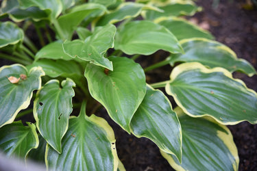 Hosta 'Sugar and Spice' is a striking perennial renowned for its bold, variegated foliage and refined habit. The large, heart-shaped leaves are thick, slightly corrugated, and slightly cupped, forming a dense mound that adds texture and colour to shaded or partially shaded gardens. The centres are green, transitioning to white margins, creating a striking contrast. In mid to late summer, tall scapes emerge carrying pale lavender flowers, providing vertical interest and attracting pollinators.