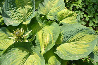 Hosta 'Supernova' is a striking perennial renowned for its bold, variegated foliage and refined habit. The large, deeply corrugated leaves are thick and slightly cupped, forming a dense mound that adds texture and colour to shaded or partially shaded gardens. In mid to late summer, tall scapes emerge carrying near-white flowers, providing vertical interest and attracting pollinators.