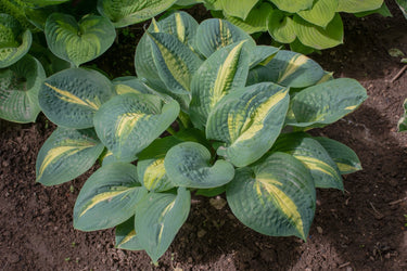Hosta 'Thunderbolt' is a striking perennial that forms a bold, upright mound of heart-shaped leaves. The leaves are deep blue-green with irregular, wavy margins that start yellow and gradually turn creamy white as the season progresses. In mid to late summer, it produces tall spikes bearing pale lavender flowers, adding vertical interest to shaded garden spaces. This cultivar thrives in moist, well-drained soils and is ideal for shaded or partially shaded areas, making it a versatile addition to woodland gardens, borders, or containers.