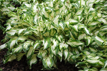 Hosta undulata 'Univittata' is a compact perennial that forms a dense, clump-forming mound of ovate, wavy leaves. The leaves are deep green with a broad, creamy white central streak, creating a striking contrast. In mid to late summer, it produces tall spikes bearing pale lavender, bell-shaped flowers, adding vertical interest to shaded garden spaces. This cultivar thrives in moist, well-drained soils and prefers partial shade to full shade, making it a versatile addition to woodland gardens, borders, or containers.