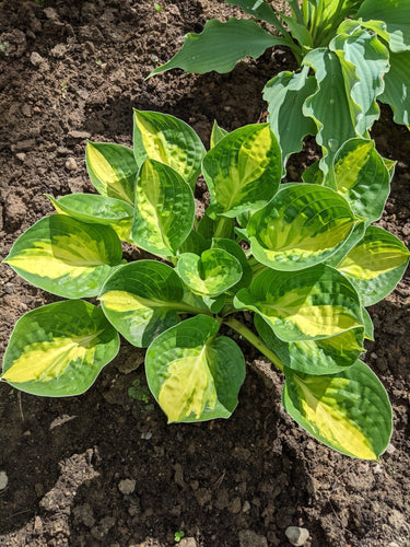 Hosta ‘Warwick Comet’ is a medium-sized perennial forming a mound of very cupped, heavily corrugated leaves. The foliage starts with a gold centre and dark green margins, later shifting with the centre ageing to creamy white, giving striking contrast. In summer it bears lavender-to-mauve flowers on tall scapes above the foliage, adding seasonal interest to shaded beds and borders. It thrives in moist, rich, well-drained soil and performs best in partial shade or full shade with protection from harsh sun.