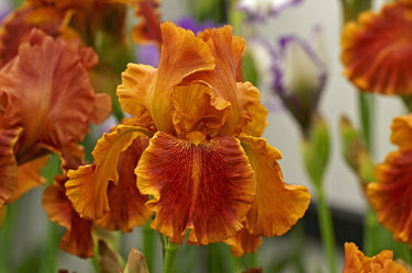 Iris germanica 'Carnival Time' is a tall bearded iris cultivar introduced by Schreiner in 1976. It features striking, ruffled, deep burnt sugar brown flowers, finely etched with deeper brown to orange texture veining. The blooms have a deep brown to orange beard, adding to their dramatic appearance. This cultivar blooms in early to midseason, typically reaching a height of approximately 91 cm (36 inches). Its bold colour and form make it a standout in any garden, offering a vibrant display during its blooming period.