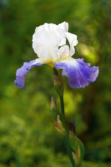 Iris germanica 'Mission Ridge' is a tall bearded iris cultivar introduced by Gordon Plough in 1972. This early to late-season bloomer features white standards and falls with a white center, blending to a delicate veronica violet at the edges. The beard is yellow deep in the throat with a white tip, and the flowers are lightly fluted, creating an elegant and refined appearance in the garden. Standing at approximately 95 cm (38 inches), it is well-suited for adding vertical interest and a touch of sophistication to garden beds and borders. Its striking appearance and robust growth make it a standout addition to any garden design.