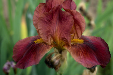 Iris germanica 'Morning Show' is a tall bearded iris cultivar introduced by Allan Ensinger in 1987. This midseason bloomer features exceptionally large, asymmetric blooms consisting of tear-shaped petals with a subtle waving at the edge. Both the upper and lower petals take on a deep, dark, red-purple colour resembling that of a ripe plum. The characteristic clumps of short hair—the beard—grow at the bases of the lower petals. Standing at approximately 60 - 70 cm (24 - 28 inches), it is well-suited for adding vertical interest and a touch of sophistication to garden beds and borders. Its striking appearance and robust growth make it a standout addition to any garden design.