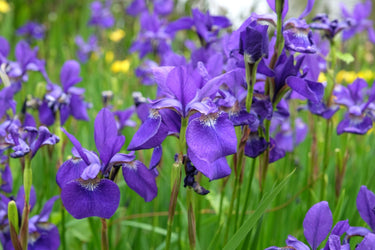 Iris sibirica 'Caesar's Brother' is a striking Siberian iris cultivar that adds a touch of elegance to any garden. The flowers feature deep purple standards and falls with a yellow and white blaze and black veining, creating a dramatic and visually appealing contrast. These blooms are not only visually captivating but also provide a unique aesthetic for borders and rock gardens.