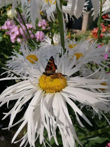 Leucanthemum × superbum 'Old Court Variety' is a classic perennial daisy with large white petals surrounding bright yellow centres. The upright flower stems rise above tidy clumps of green, toothed foliage, creating a bold and cheerful display in borders, cottage gardens, and mixed perennial beds. Its long-lasting summer blooms and structured habit make it ideal for adding continuous colour and visual interest to sunny garden spaces.