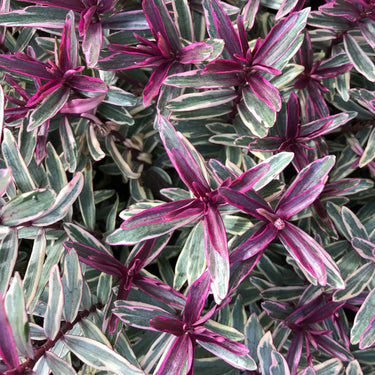 An evergreen shrub with glossy variegated leaves, the leaves are green in the centre with a creamy yellow edge outlined in deep purple. Flowers are loved by Butterflies and Bees.