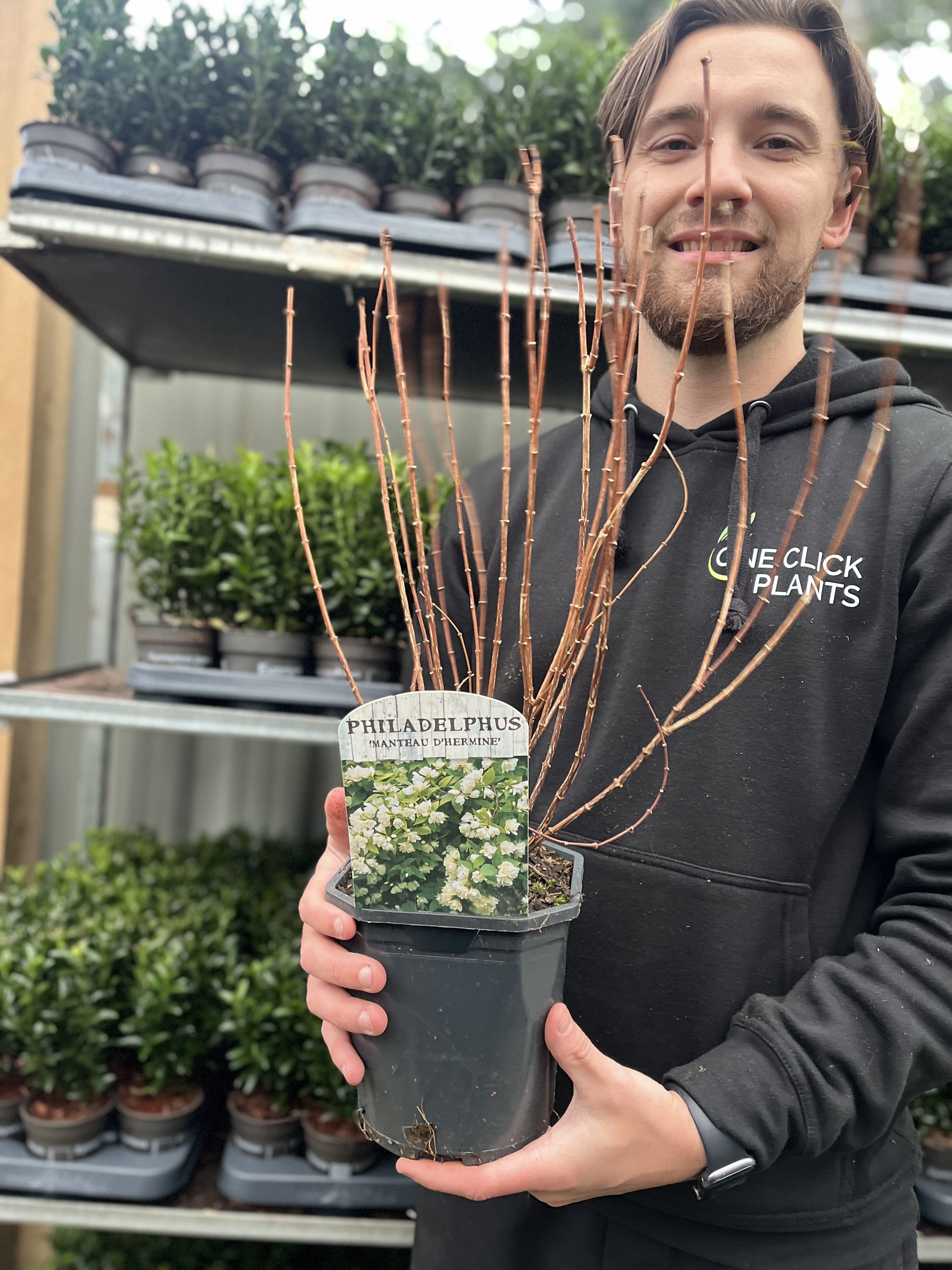 Philadelphus ‘Manteau d’Hermine’ is a charming deciduous shrub prized for its abundant, fragrant white flowers that bloom in late spring to early summer. The large, star-like blooms have a sweet scent that fills the air, making it a perfect addition to borders, hedges, or cut flower gardens. The plant’s dark green foliage provides a beautiful backdrop, and its graceful, arching branches give it an elegant, airy appearance. ‘Manteau d’Hermine’ is both easy to care for and hardy, making it a reliable choice for UK gardens seeking year-round beauty and fragrance.