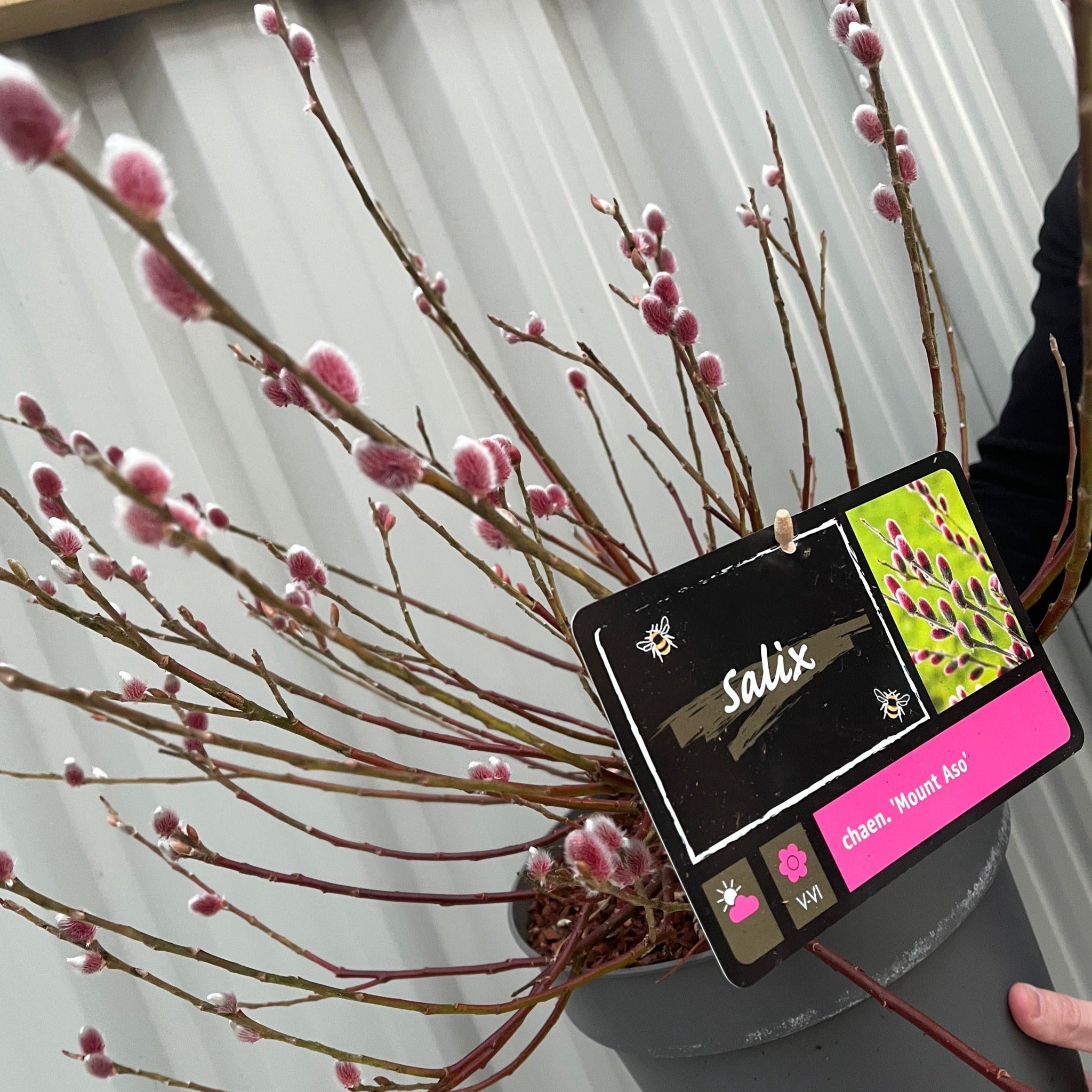 'Mount Aso' is a bushy deciduous shrub, also known as Pussy Willow. The catkins appear fluffy Pink before opening their leaves that turn from a shade of blue to silver to grey throughout the Spring and Summer.