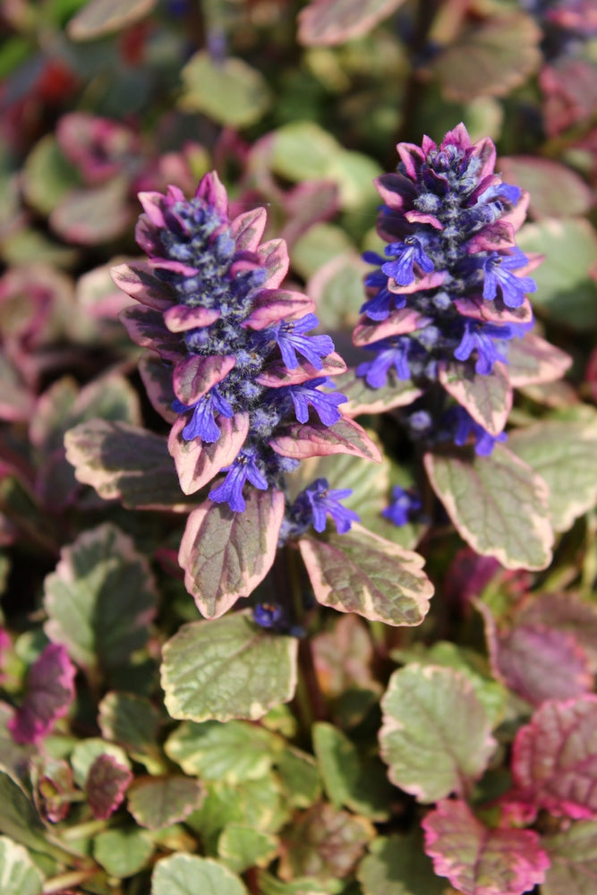 Ajuga reptans 'Burgundy Glow', commonly known as bugle, is a low-growing, mat-forming perennial noted for its striking variegated foliage in shades of cream, pink, green, and burgundy. In spring to early summer, short spikes of vivid blue flowers rise just above the colourful leaves, creating a strong contrast and adding seasonal interest at ground level.