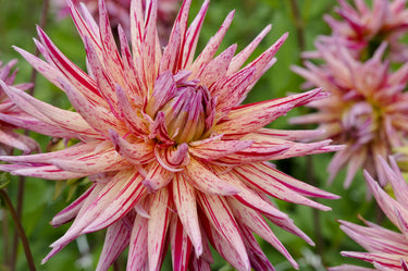 Dahlia ‘Alain Mimoun’ boasts large, fully double blooms in soft peach-pink shades with a delicate, classic form. Upright and robust, it flowers from midsummer to autumn, making it ideal for borders, beds, or cut flowers, adding elegant, long-lasting colour to the garden.