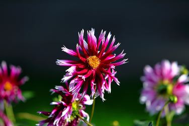 Dahlia ‘Alauna Clair-Obscur’ displays stunning bi-coloured blooms with deep red centers fading to soft pink edges. Upright and robust, it flowers from midsummer to frost, adding dramatic, long-lasting colour to borders, beds, and cut flower arrangements.
