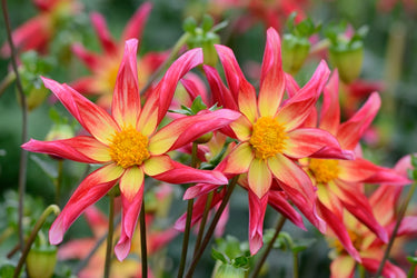Dahlia ‘Honka Surprise’ showcases unique star-shaped blooms with soft pink petals tipped in white around a sunny yellow centre. Light, airy, and elegant, it adds charm to borders and pollinator gardens. A long-flowering, easy-to-grow variety that brings delicate colour from midsummer to autumn.