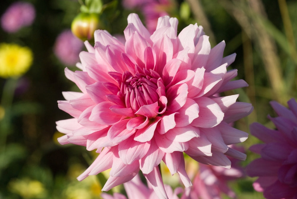 Dahlia ‘Lilac Time’ showcases soft lilac-purple, fully double blooms with a classic rounded form. Upright and compact, it flowers from midsummer to autumn, adding gentle, long-lasting colour and charm to borders, beds, and cut flower arrangements.