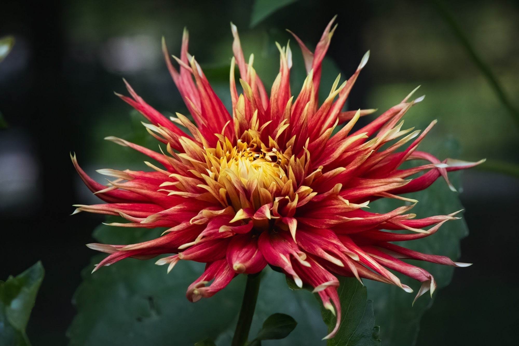‘Show ‘n’ Tell’ explodes with fiery, spiky blooms: narrow petals of orange‑red tipped with yellow swirl out in dramatic, laciniated flowers that catch the eye from across the garden. Its robust stems and long flowering season — from mid‑summer right through to first frosts — make it a dramatic standout in borders or a bold choice for cut‑flower displays. The large size and bright, warm colour of the blooms make it a “showstopper” variety for any summer planting.