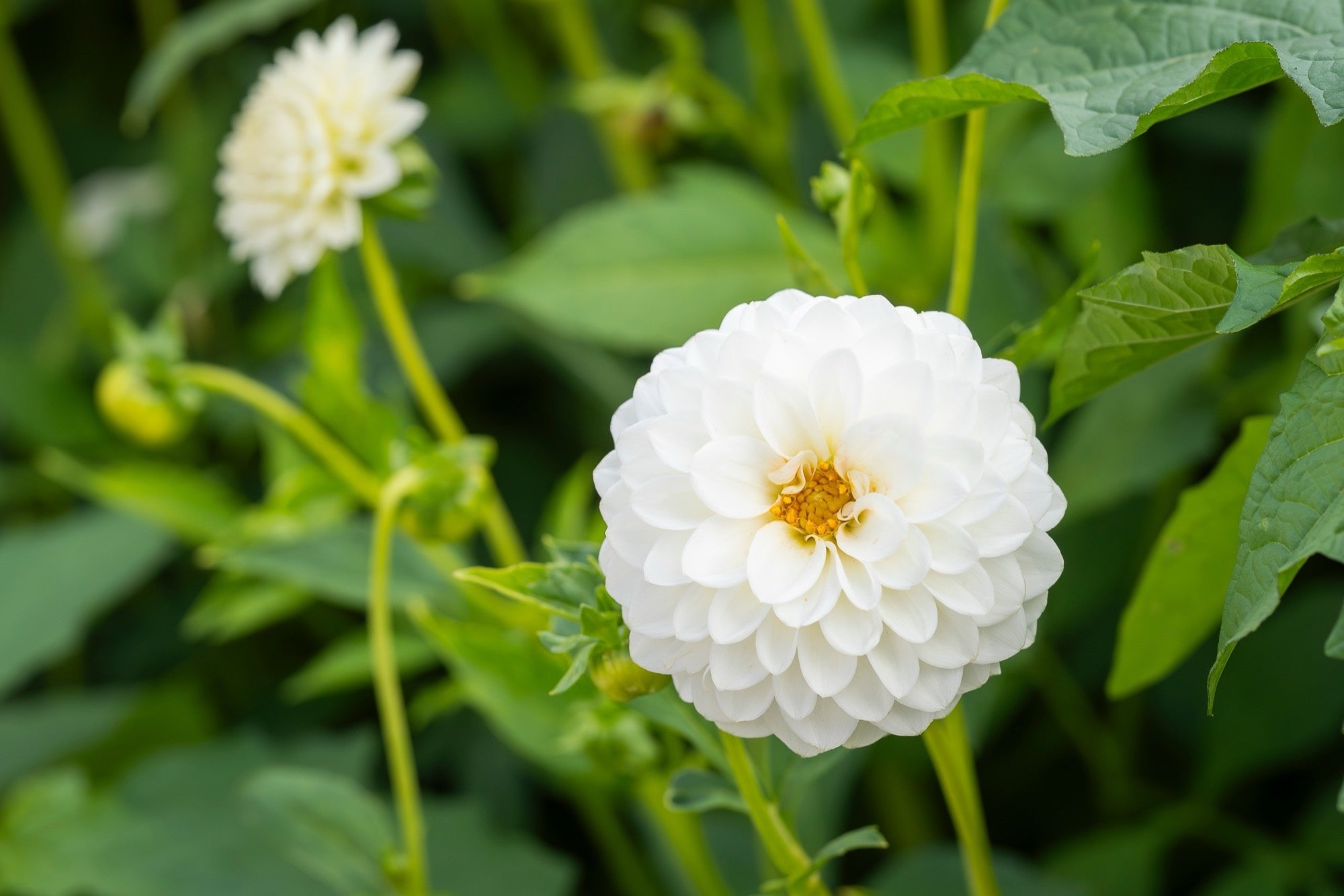 ‘Snowflake’ bursts into clusters of neat, pure‑white pompon blooms, each formed of tightly inrolled petals that give a crisp, spherical appearance. Its cheerful, compact form works beautifully in borders, containers or as part of a larger dahlia display. Flowering from midsummer until the first frost, it brings crisp white colour and texture through much of the season.
