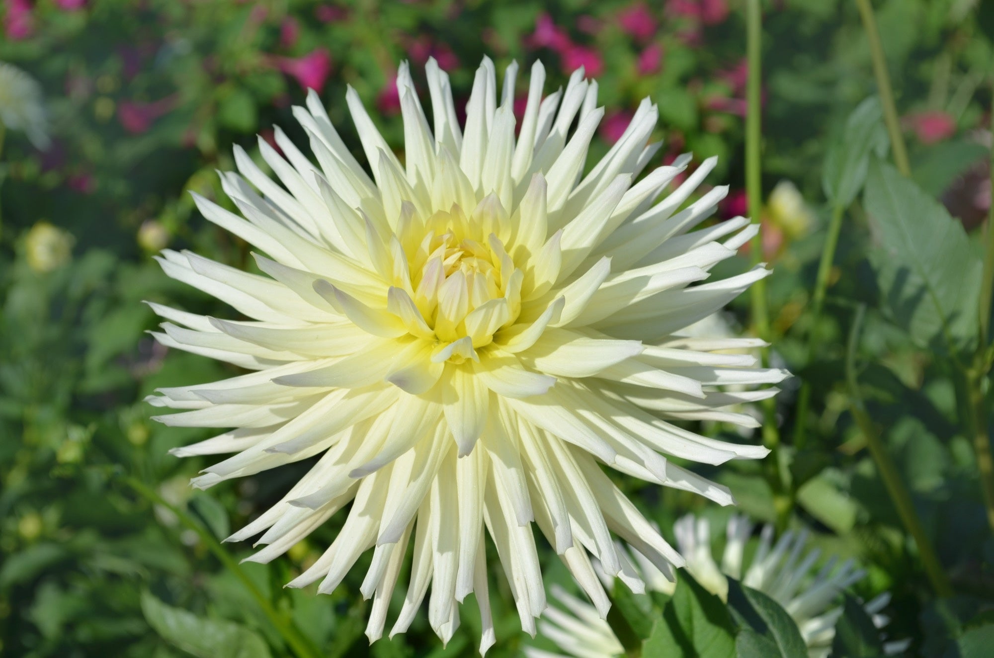 ‘White Star’ dazzles with creamy‑white, spiky semi‑cactus blooms that have a soft lemon-yellow centre, giving each flower a sculptural, starburst effect. It carries tall, elegant stems and thrives in full sun, flowering from midsummer through to the first frosts — perfect for garden borders or dramatic cut-flower displays.