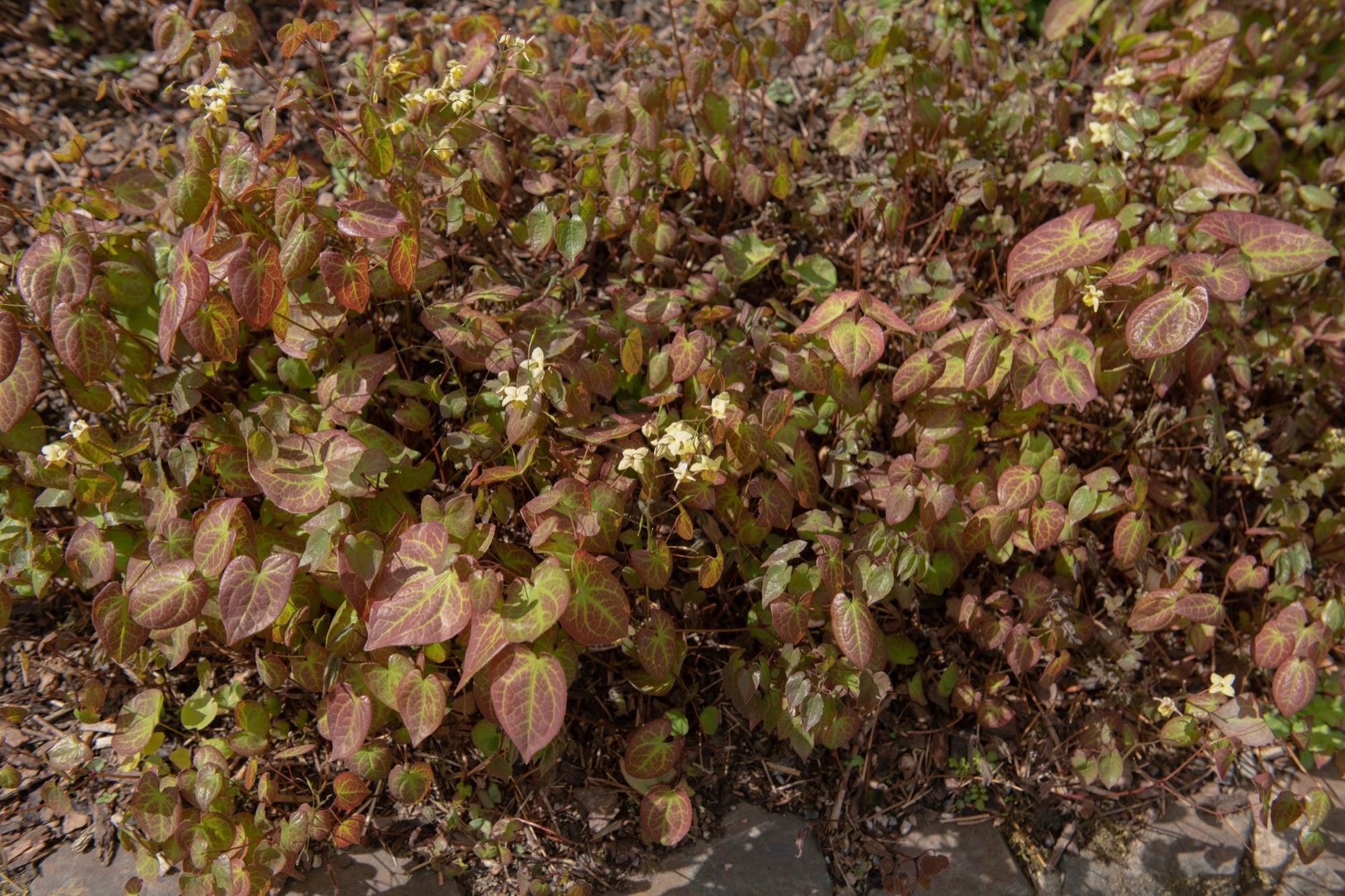 Epimedium versicolor 'Neosulphureum' is a clump-forming, evergreen perennial prized for its soft yellow spring flowers that emerge above bronzed young foliage. The blooms appear in airy sprays, providing a delicate contrast to the developing leaves, which shift from reddish tones in spring to mid-green in summer before turning shades of red and bronze in autumn. Its long-lasting foliage adds structure and year-round appeal, making it an excellent choice for shaded borders, woodland gardens, or as reliable groundcover.