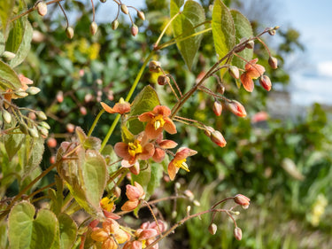 Epimedium × warleyense is a hardy, evergreen perennial valued for its sprays of pale yellow flowers with maroon-red markings that appear in spring above heart-shaped, bronze-tinged young foliage. The leaves mature to glossy green and develop red and bronze tones in autumn, providing year-round interest. Its dense, spreading habit makes it ideal as groundcover or for shaded borders and woodland-style plantings, while the delicate flowers attract pollinators and add seasonal charm.