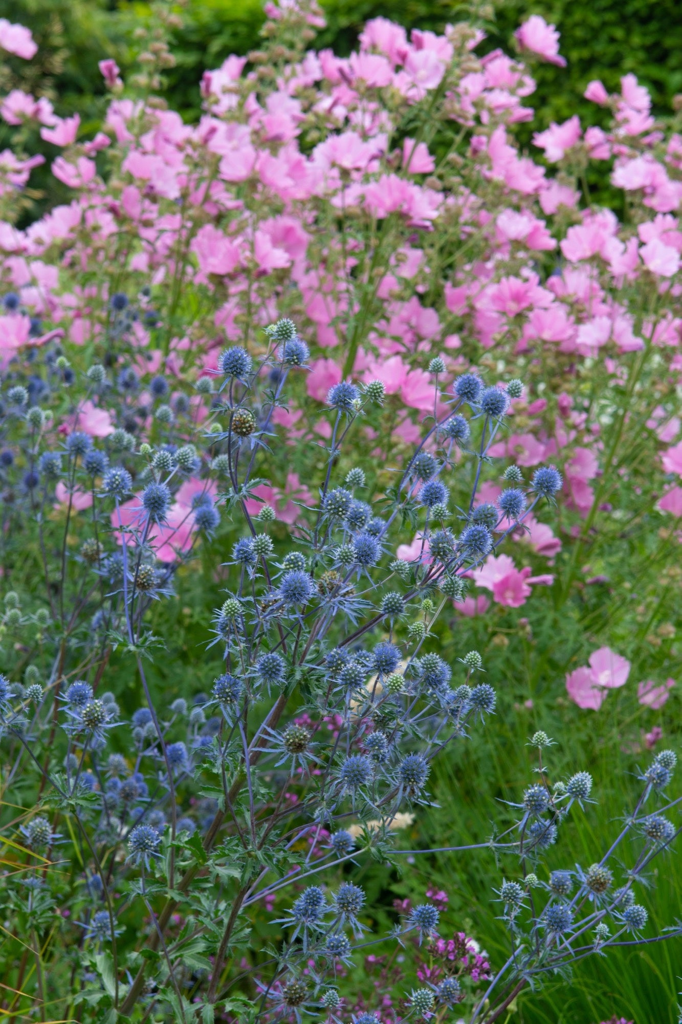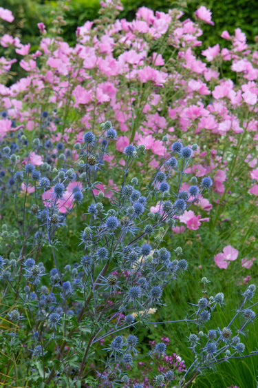 Eryngium planum 'Blauer Zwerg' is a captivating perennial that adds both texture and colour to sunny borders and dry meadows. This compact cultivar produces striking, thistle-like flower heads with spiny, silvery-blue bracts, creating a dramatic effect from mid to late summer. The leathery, dark green basal leaves are spiny and highly divided, forming a low rosette that supports the upright, branched stems. 'Blauer Zwerg' is particularly attractive to bees and butterflies, enhancing garden biodiversity.