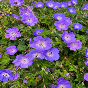 Geranium 'Rozanne' is an award-winning perennial prized for its profusion of large, violet-blue flowers with delicate white centres and subtle veining. Blooming continuously from late spring to early autumn, this variety offers one of the longest flowering seasons among hardy geraniums. Its spreading, mounding habit is complemented by attractive, deeply lobed green foliage that may develop red tones in autumn, adding seasonal interest. Perfect for borders, containers, or ground cover, 'Rozanne' thrives in full sun to partial shade and well-drained soil. Low-maintenance and resilient, it is highly drought-tolerant and resistant to pests and diseases. Loved by pollinators, Geranium 'Rozanne' is an excellent choice for creating vibrant, wildlife-friendly gardens while providing enduring beauty and reliable performance.