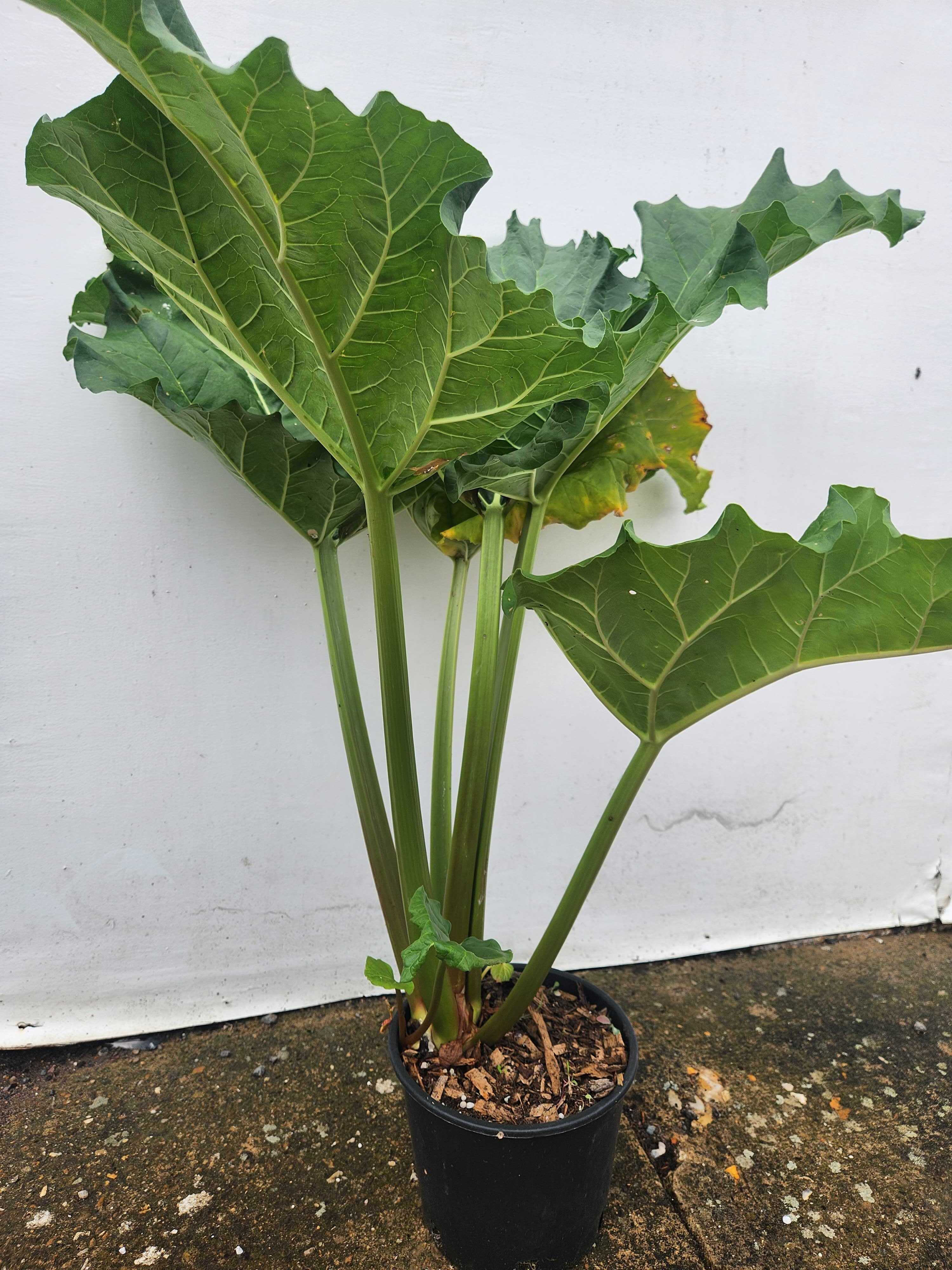 The Goliath rhubarb (Rheum × hybridum 'Goliath') is a striking, robust perennial known for its enormous leaves and thick, edible red-green stalks. As its name suggests, it’s a particularly large and vigorous variety, producing heavy crops of long, fleshy stems ideal for pies, crumbles, jams, and compotes. Its dramatic foliage also adds ornamental value, making it a bold statement in kitchen gardens and borders alike.