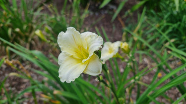 Hemerocallis 'Joan Senior' is a semi-evergreen, diploid daylily cultivar renowned for its elegant, near-white flowers with a soft lime-green throat. Each lightly ruffled bloom measures approximately 15 cm (6 inches) in diameter and typically lasts for a single day, blooming early to midseason with potential rebloom throughout the summer.
