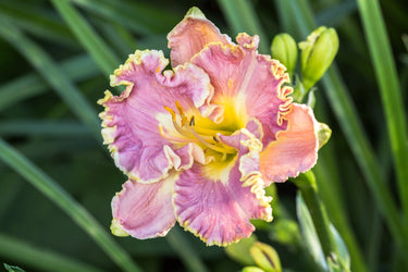 Hemerocallis 'Lavender Tutu' is a semi-evergreen daylily cultivar celebrated for its large, delicately ruffled blooms in a soft lavender hue adorned with yellow-green throats. Each bloom measures approximately 15 – 18 cm (6 – 7 inches) in diameter and typically lasts for a single day. This cultivar is a rebloomer, producing a second set of flowers later in the season, extending its ornamental appeal. The plant's fragrant blooms attract butterflies and hummingbirds, adding dynamic interest to the garden. Its grass-like foliage remains green throughout the season, providing a consistent backdrop for the vibrant flowers.