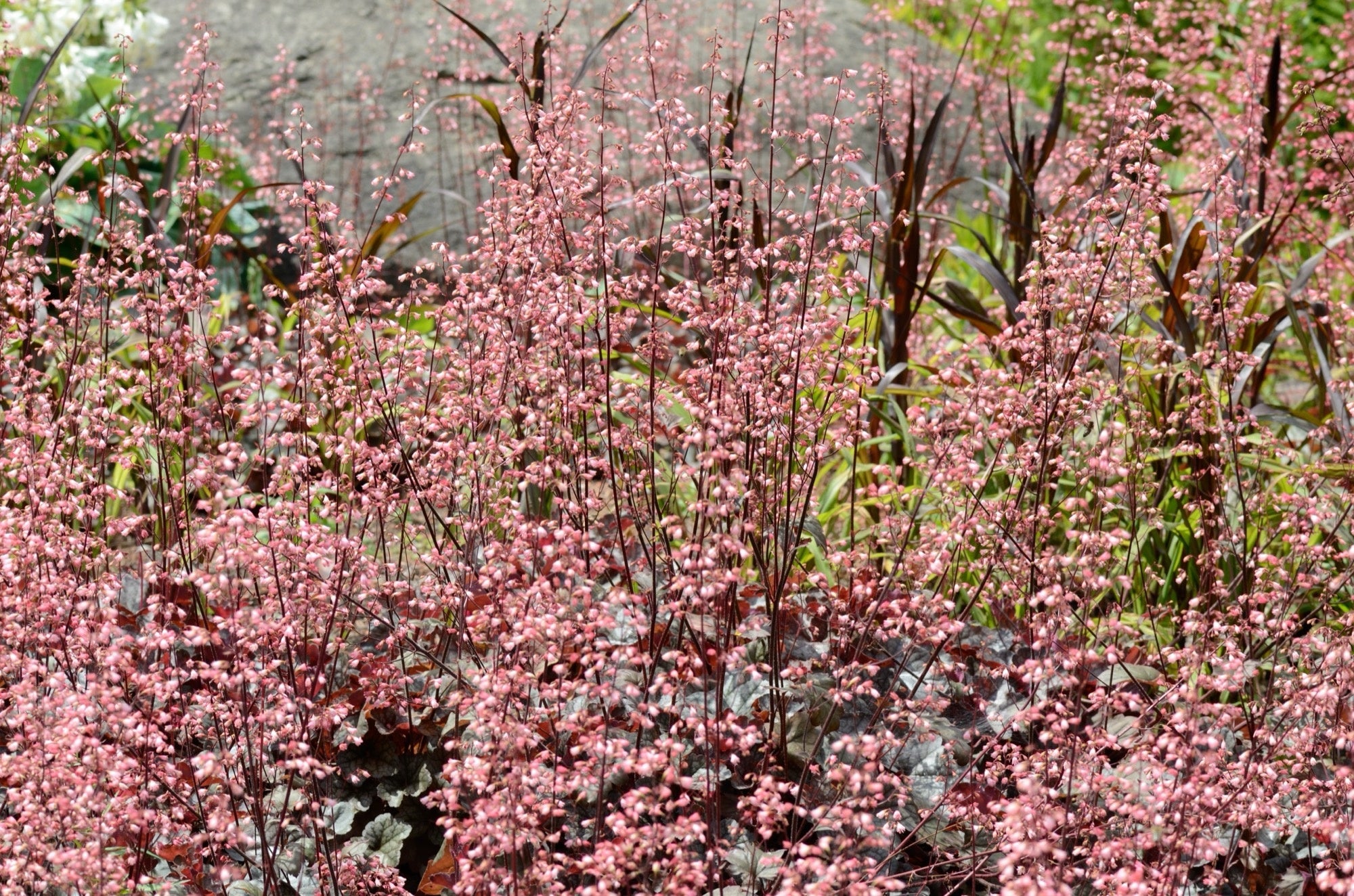 Heuchera 'Amethyst Myst' is an evergreen perennial admired for its striking, deep purple to amethyst-hued foliage that forms neat, rounded clumps. In late spring to early summer, delicate sprays of small, bell-shaped flowers rise above the foliage, adding light texture and subtle seasonal interest. Its bold leaf colour and compact habit make it perfect for borders, rockeries, woodland gardens, or container plantings.