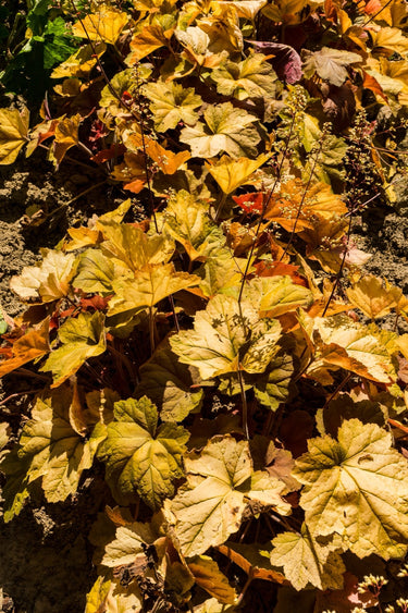Heuchera 'Cappucino' is an evergreen perennial valued for its warm, coffee-brown foliage that forms dense, rounded clumps. In late spring to early summer, delicate sprays of small, bell-shaped flowers rise above the foliage, adding subtle seasonal interest and a light, airy texture. Its rich leaf colour and compact habit make it ideal for borders, rockeries, woodland gardens, or container plantings.