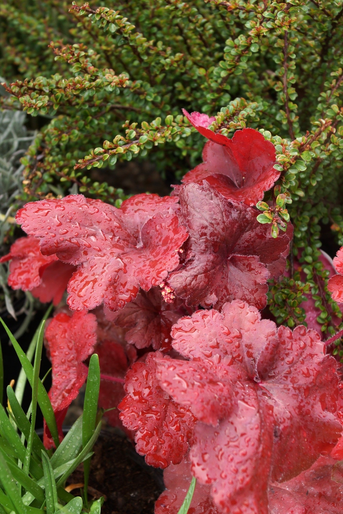 Heuchera 'Fire Alarm' is an evergreen perennial celebrated for its vibrant, fiery red foliage that forms dense, rounded clumps. In late spring to early summer, delicate sprays of small, bell-shaped flowers rise above the leaves, adding a light, airy texture and seasonal interest. Its bold leaf colour and compact habit make it ideal for borders, rockeries, woodland gardens, or container plantings.