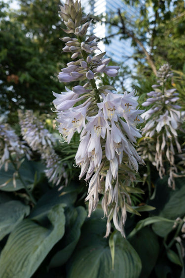 Hosta 'Alligator Alley' is a hardy, shade-loving perennial valued for its dramatic variegated foliage. The leaves are thick, puckered, and heavily textured, with striking blue-green margins that contrast beautifully against bright yellow centres. In summer, upright spikes of pale lavender flowers rise above the mound, bringing additional colour and attracting pollinators to the garden. Its bold foliage and strong form make it a standout feature in shaded areas.