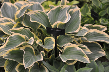 Hosta 'Clifford's Forest Fire' is a hardy perennial admired for its bold, variegated foliage. The green leaves are edged with wide, creamy-yellow margins and form dense, mounded clumps, adding striking contrast and structure to shaded garden areas. In midsummer, upright spikes of pale lavender flowers rise above the foliage, providing height, seasonal interest, and attracting pollinators. Its dramatic leaf colour and tidy habit make it ideal for borders, woodland gardens, or container planting.