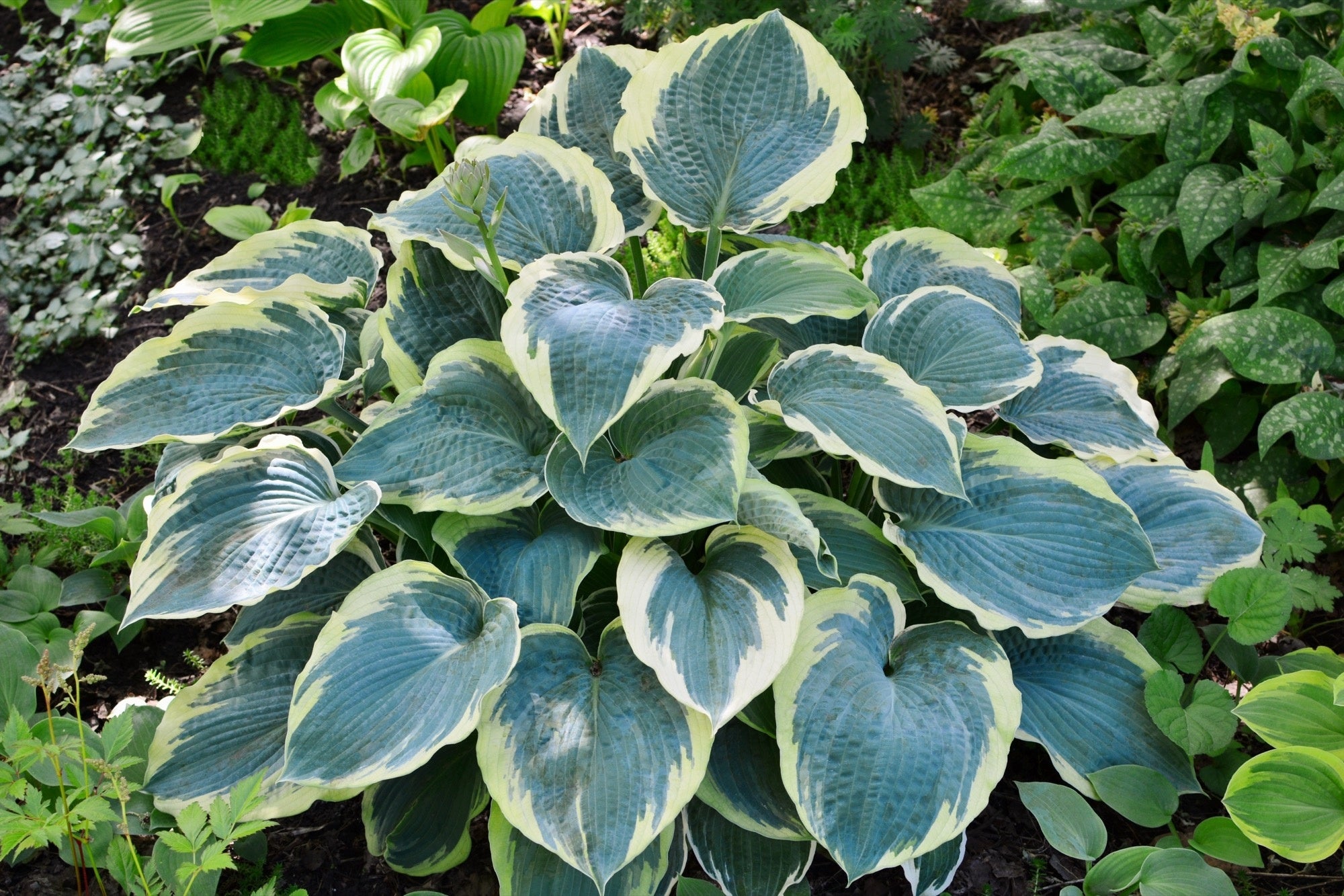 Hosta 'Earth Angel' is a striking, large-sized perennial that forms a dense, rounded mound of thick, heart-shaped leaves. The foliage features a broad blue-green centre surrounded by wide, creamy-white margins, which may develop streaks where the centre and margin overlap. The leaves are slightly cupped, corrugated, and glaucous on top, adding texture and interest to shaded garden areas.