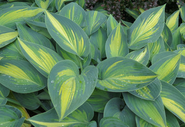 Hosta 'June' is a striking perennial that adds both texture and structure to shaded garden spaces. This cultivar features heart-shaped leaves with a creamy-white centre that changes to a dark chartreuse, surrounded by blue-green edges. The foliage forms a dense, upright mound, making it an excellent choice for borders, woodland gardens, or as a specimen plant in containers. The wide, rippled margins add a dramatic effect, creating a bold contrast against the centre of the leaves.