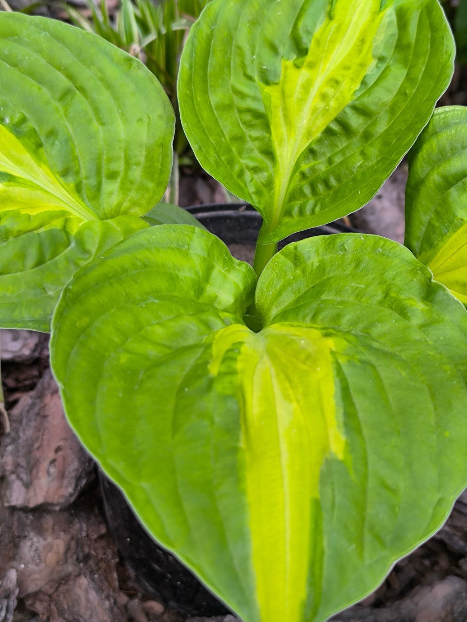 Hosta ‘Mango Tango’ is a striking medium-sized perennial valued for its dramatic variegated foliage and texture. The leaves are broadly rounded with a glossy green margin and a creamy-yellow centre stripe that is narrow and irregular, giving a “reverse” effect to patterns seen on cultivars like ‘Stitch in Time’. As the season advances, the leaves develop a puckered or lightly corrugated surface, adding depth and a stitched appearance that draws the eye in shady garden beds.