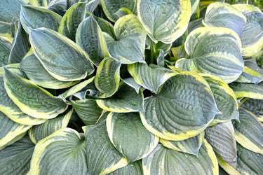 Hosta ‘Sagae’ is a majestic perennial, renowned for its large, heart-shaped leaves with striking variegation. The foliage is blue-green with irregular creamy-yellow to white margins that lighten as the season progresses, giving a bold and elegant effect. The leaves are slightly wavy and held upright, creating a vase-shaped form that adds architectural interest to shady borders. In summer, tall flower scapes rise above the foliage to display pale lavender blooms, which attract pollinators and add vertical contrast.