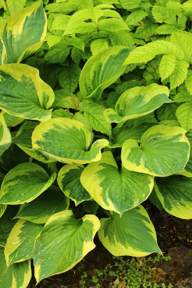 Hosta 'Twilight' is a medium-sized perennial that forms a dense, clump-forming mound of heart-shaped leaves. The leaves are dark green with wide golden margins that fade to creamy white as the season progresses, adding a dynamic contrast to shaded garden areas. In mid to late summer, it produces tall spikes bearing pale lavender flowers, adding vertical interest to shaded garden spaces. This cultivar thrives in moist, well-drained soils and prefers partial shade to full shade, making it a versatile addition to woodland gardens, borders, or containers.