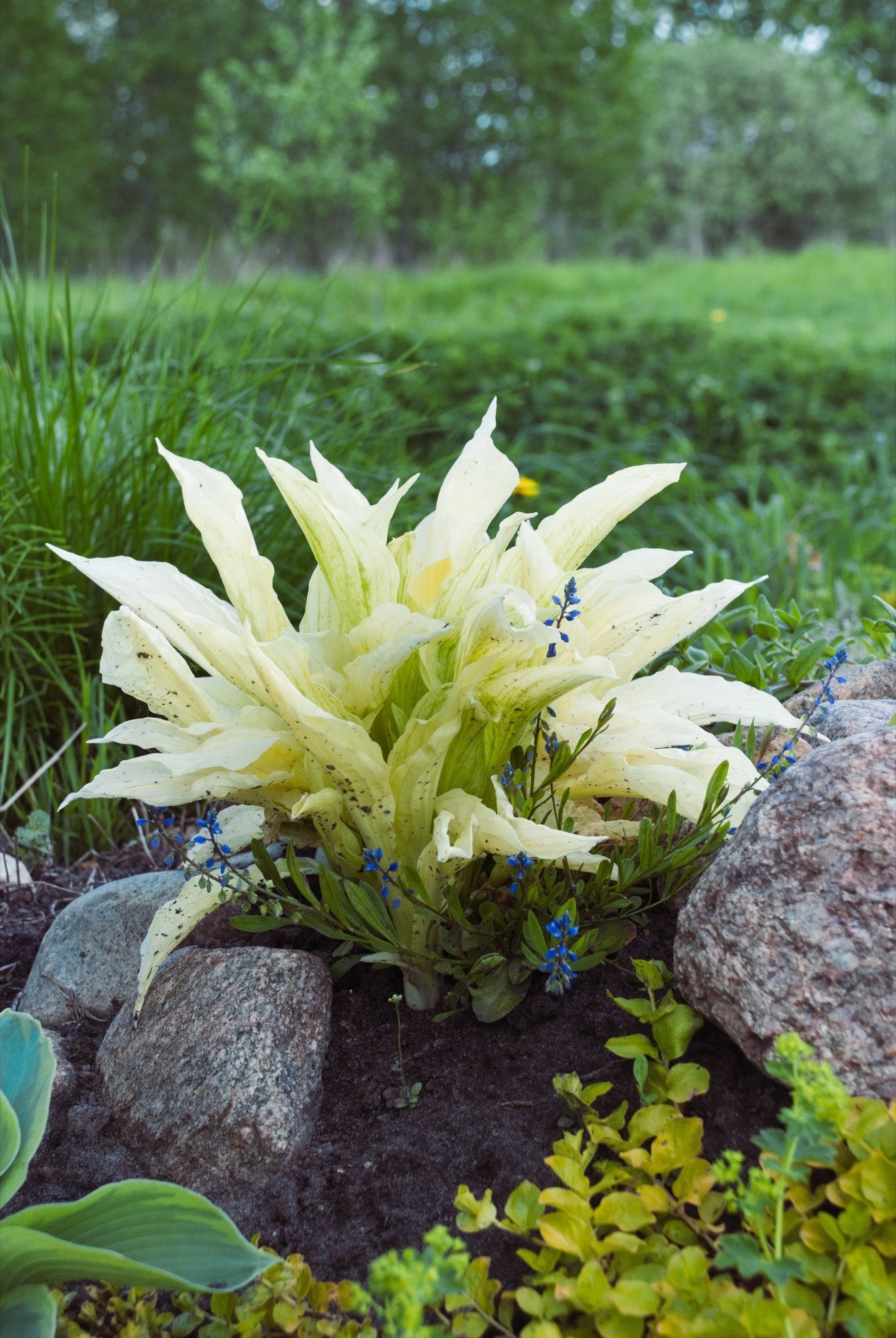Hosta 'White Feather' is a delicate and striking miniature perennial valued for its almost pure ivory-white foliage in early spring, which gradually develops green streaks along the veins as the season advances. The leaves are pointed with wavy edges and have a matte surface above and a glossier underside, creating interesting texture contrasts. In mid to late summer it produces spikes of lavender-purple flowers that rise above the foliage, adding soft floral interest without overwhelming its subtle, elegant form.
