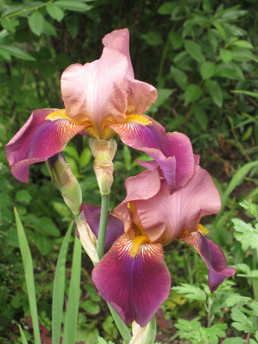 Iris germanica 'Indian Chief' is a striking tall bearded iris cultivar introduced in 1929 by Dr. Wylie Ayres. This historic variety features maroon bitone flowers, with 'netted' standards that are wire-edged in a contrasting colour, and deep, velvety falls that add to its dramatic appearance. The bright orange to deep yellow beard further enhances the flower's vibrant colour palette. 'Indian Chief' is known for its vigorous growth and ability to thrive even in partial shade, making it a resilient choice for various garden conditions.