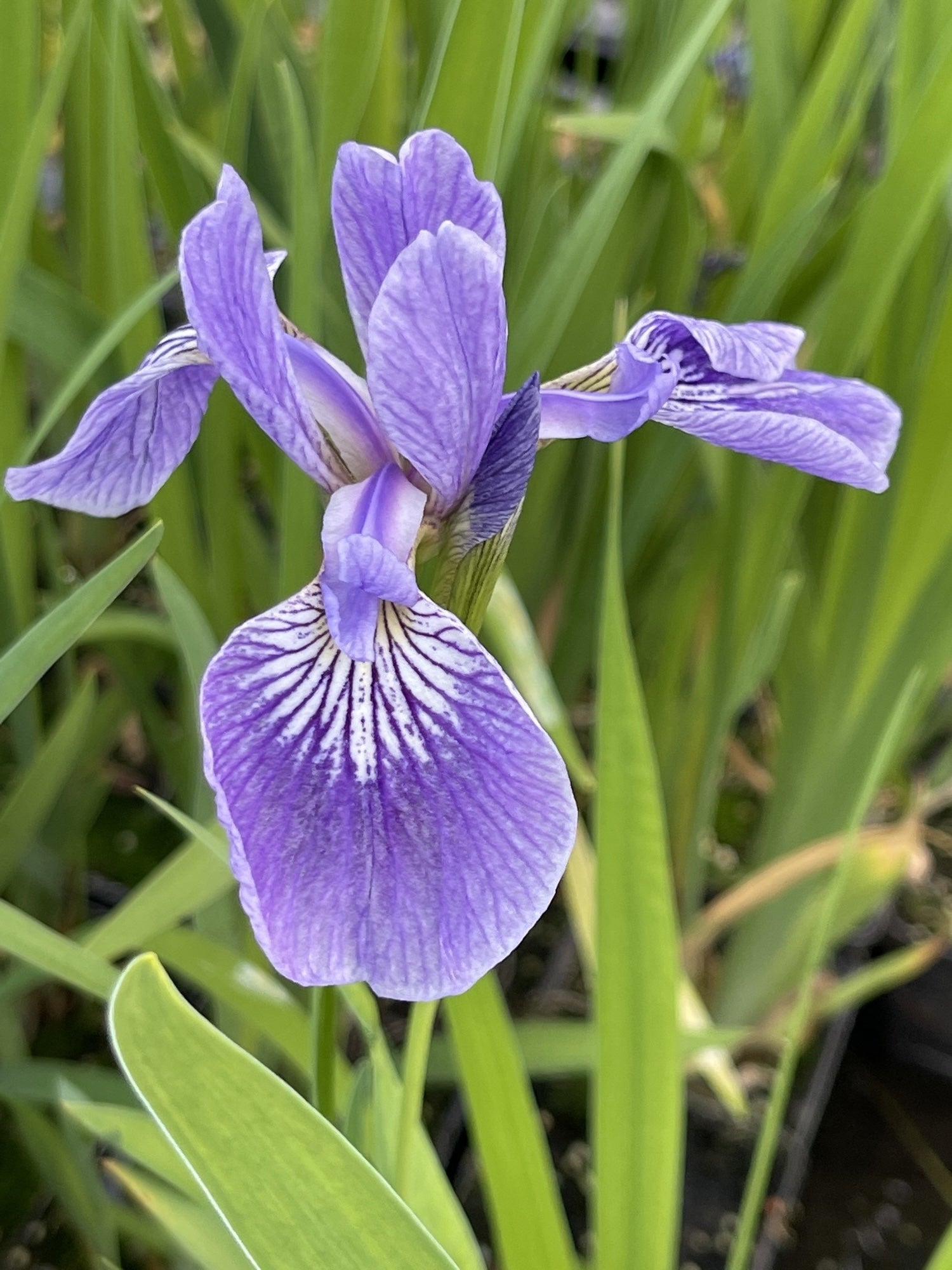 Iris versicolor, commonly known as blue flag iris 'Pacifica', is a clump-forming perennial with upright, sword-shaped green leaves forming dense, architectural foliage. In late spring to early summer it produces large, striking flowers in soft violet-blue shades with subtle yellow and white markings, creating an elegant and naturalistic display along pond margins and in shallow water.