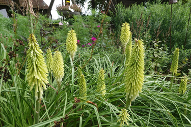 Kniphofia 'Green Jade' is a distinctive perennial that brings unique colouring and elegant structure to the garden. Its upright flower spikes are adorned with creamy-white blooms that gradually fade to soft green, giving a cool, refreshing look that stands out from the fiery hues more typical of the genus. The slender, grass-like foliage forms neat clumps that provide year-round structure, while the tall flower spikes rise dramatically above, adding architectural appeal. This unusual colouring makes 'Green Jade' an excellent choice for contrasting with more vibrant perennials or for creating a calming planting scheme.